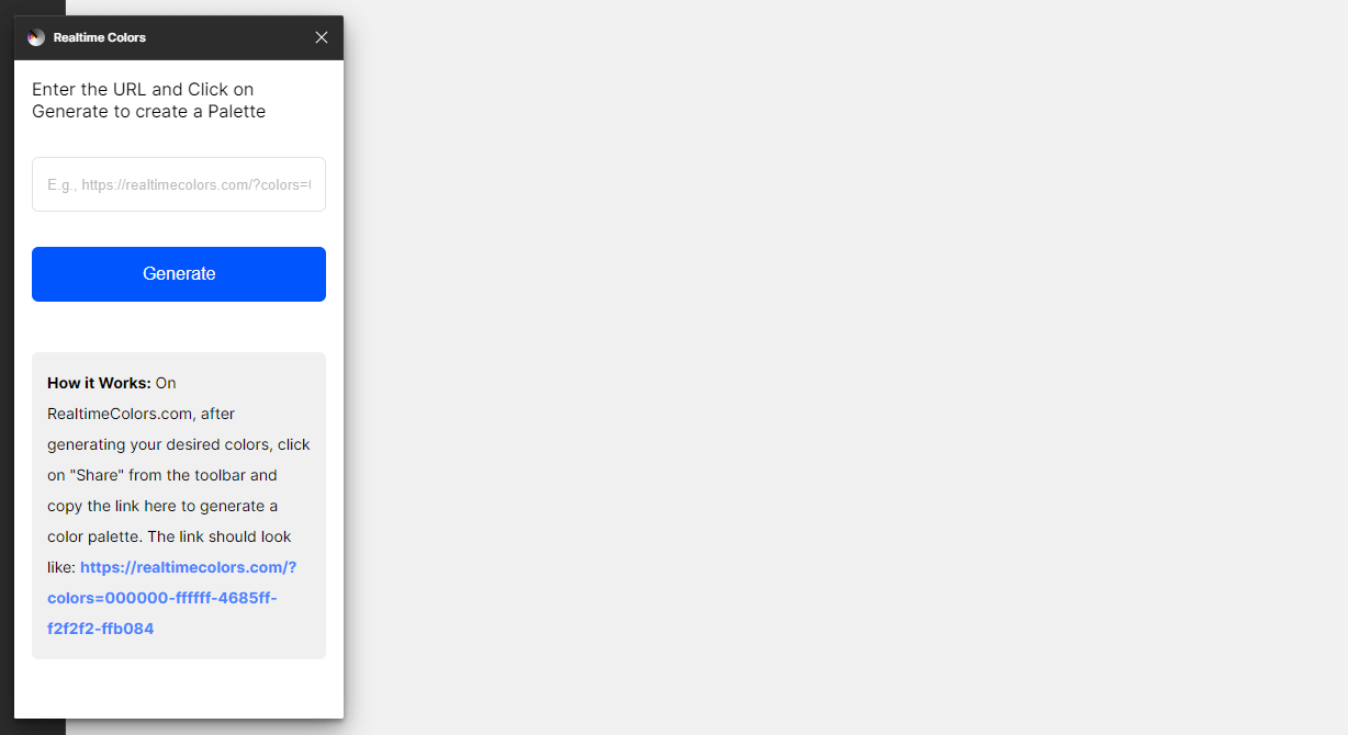 Using this plugin is fairly simple. You can copy the Realtime Colors page URL with your selected colors (use the shortcut Ctrl+S) and paste it in the link input. Then, press Generate and receive a color palette inside a frame named Color Styles.